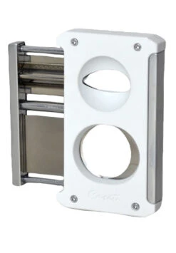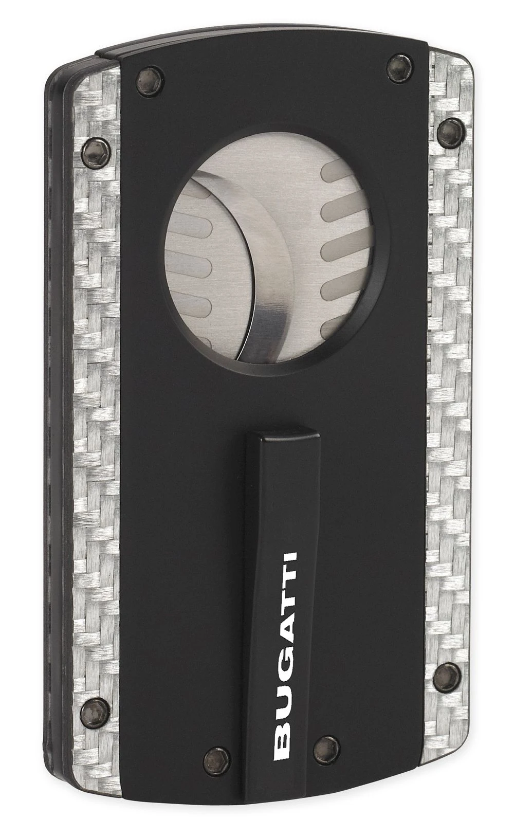 Cuts up to 56 Ring Gauge Cigars; Guillotine StyleTwin, Stainless Steel Blades; Spring LoadedApprox. Dimensions: (L) 3.0 in x (W) 1.75 in x (H) 0.25 inSilver Carbon Fiber Accents with Black Matte; Extremely Durable & LightweightPackaged in Black Bugatti Giftbox & Bugatti Brand Cardboard Box