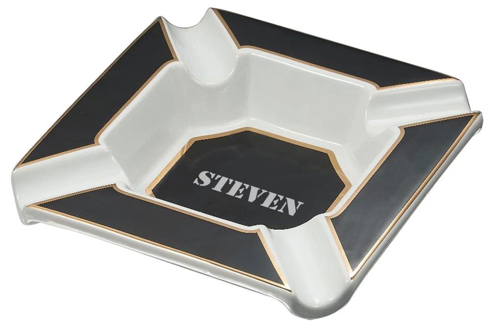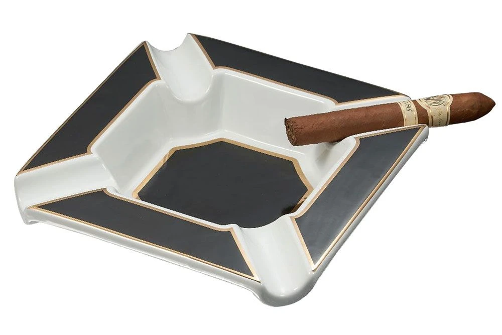 Perfect for gatherings, this large cigar ashtray makes an excellent centerpiece to any cigar-oriented event. The Festus features four large cigar rests and a wide and deep ash basin so you can enjoy your favorite cigars for hours. Each edge is trimmed in gold over the black finish on the white porcelain ashtray